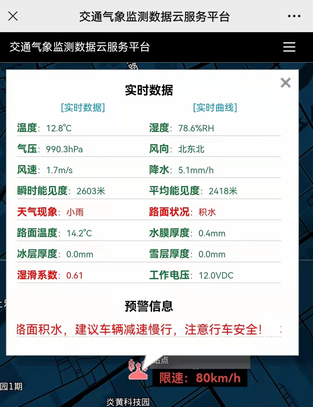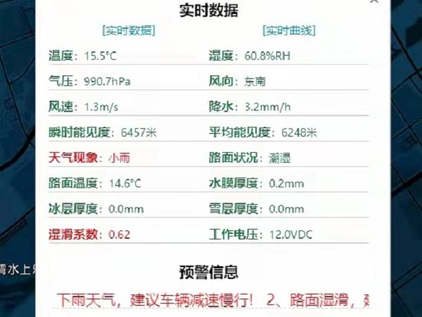 雨天情況下,其天氣現象,濕滑系數、路面狀況均會(huì )顯示紅色字體,及相關(guān)數據信息,并且有預警信息,提醒:下雨天氣,路面濕滑,建議車(chē)輛減速慢性,注意行車(chē)安全,并且有限速提醒。