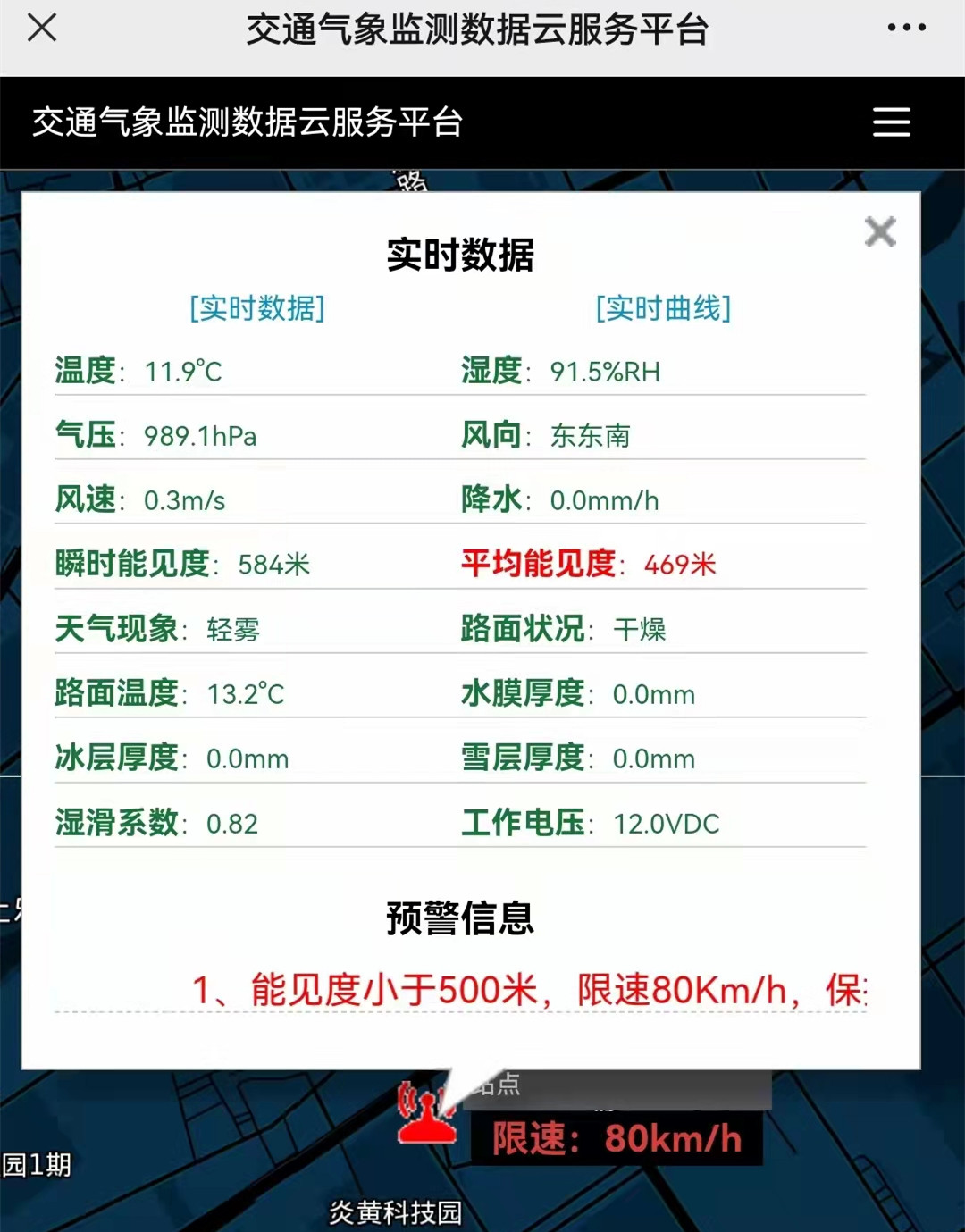 霧天情況下,在實(shí)時(shí)數據中對于平均能見(jiàn)度會(huì )顯示紅色字體,其能見(jiàn)度距離也有具體展現,并提示預警信息:能見(jiàn)度小于多少米,限速多少,保持車(chē)距等相關(guān)提醒。