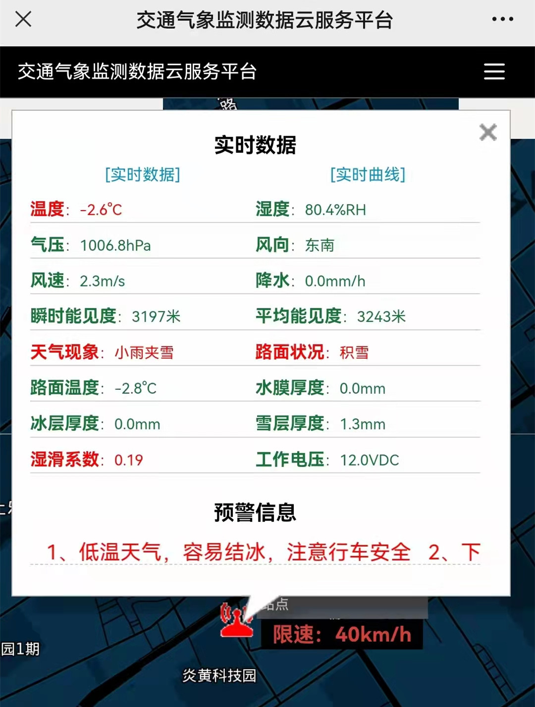 下雪天,在實(shí)時(shí)數據中的溫度、天氣現象、濕滑系數、路面狀況等數據都會(huì )顯示為紅色,并預警提醒:低溫天氣,容易結冰,限速多少等信息。
