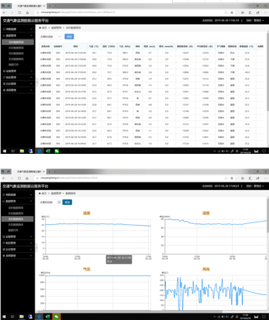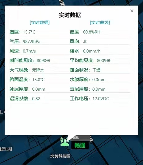 在監測平臺中,實(shí)時(shí)數據主要展現數據有:溫度、氣壓、風(fēng)速、瞬時(shí)能見(jiàn)度、天氣現象、路面溫度、冰層厚度、濕滑系數、濕度、風(fēng)向、降水、平均能見(jiàn)度、路面狀況、水膜厚度、雪層厚度、工作電壓等,不同的氣象要素可根據需求進(jìn)行定制。